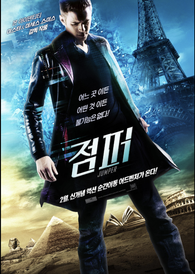 <점퍼>은 2008년 국내 개봉한 영화로 관객수 166만 명으로 감독은 더그라이만 감독이다. 소설을 원작으로 장르는 SF, 스릴러, 액션으로 신선한 소재로 순간이동 시공간을 넘어 세계명소들을 볼 수 있는 SF 스릴러 액션이다. 영화의 등장인물은 다음과 같다. 어디든 마음먹으면 사진 한 장으로 날아라는 헤이든 크리스텐스(데이비드역), 신의 영역을 침범했다고 점퍼들만 잡으로 다니는 사무엘잭슨(롤랜드역), 데이비드의 점퍼 선배님으로 나온 제이미 벨(그린핀역), 점퍼가 사랑했던 여자친구 레이철 빌슨(밀리 해리스역), 다이안 레인(메리 라이스역), 마이클 루커(윌리엄라이스역)가 케라를 맡았다. 각자 개성 있는 캐릭터를 살렸다. 166만 명의 영화를 본 관객들은 순간이동을 토대로 SF스릴러에 신선함을 주는 영화였다. 영화에서 나오는 롤랜드의 대사가 기억난다."신만이 가져야 할 능력이다." 멋진 능력을 가진 데이비드는 자신만의 이익을 위해 사용하지 않는다. 저런 능력이 생기면 나는 어떤 곳으로 가볼까? 어디든지 갈 수 있다면 긴 비행기를 타지 않고 열심히 운전해서 몇 시간씩 가지 않아도 되니 정말 좋은 상상만 해봐도 멋진 능력인 것 같다.
