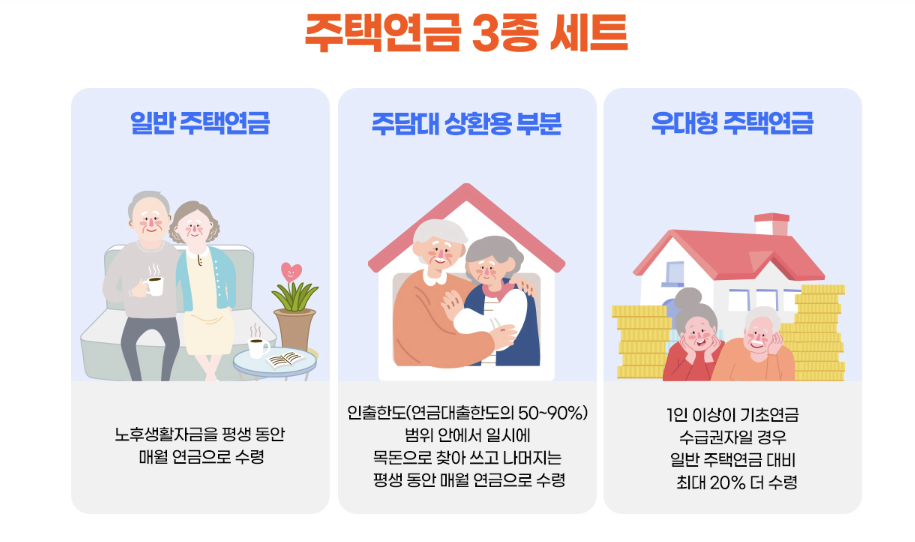 - 주담대 상환용 주택연금 : 주택담보대출 상환용으로 인출한도(연금대출한도의 50%~90%) 범위 안에서 일시에 목독을 찾아 쓰고, 나머지는 평생 동안 매월 연금으로 수령